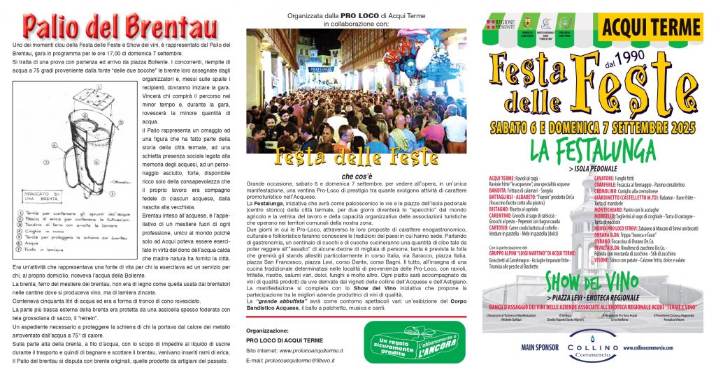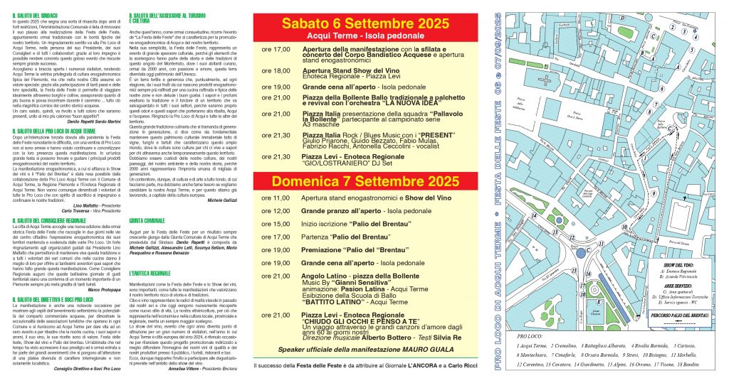 Due giorni in cui le Pro-Loco, attraverso le loro proposte di carattere enogastronomico, culturale e folkloristico faranno conoscere le tradizioni dei paesi in cui hanno sede. Parlando di gastronomia, un centinaio di cuochi e di cuoche cucineranno una quantità di cibo tale da poter reggere all’”assalto” di alcune decine di migliaia di persone, tanta è prevista la folla che gremirà gli stands allestiti particolarmente in corso Italia, via Saracco, piazza Italia, piazza San Francesco, piazza Levi, corso Dante, corso Bagni. Il tutto, all’insegna di una cucina tradizionale determinatasi nelle località di provenienza delle Pro-Loco, con ravioli, frittelle, risotto, salumi vari, dolci, funghi e molto altro. Ogni piatto sarà accompagnato da vini di qualità prodotti da uve derivate dai vigneti delle colline dell’Acquese e dell’Astigiano.